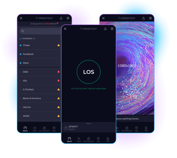 Unser Ziel bei Speedtest by Ookla® ist es, das Internet zu beschleunigen, in dem wir Daten und Einblicke in die tatsächlichen Internetgeschwindigkeiten liefern. Mit Milliarden von Tests weltweit unterstützen wir Sie dort, wo Sie sich aufhalten, mit Apps für die Geräte, die Sie am häufigsten verwenden.